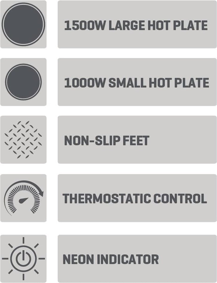 This 2500W hob has durable, high-quality cast iron heating elements for fast and long-lasting heating.