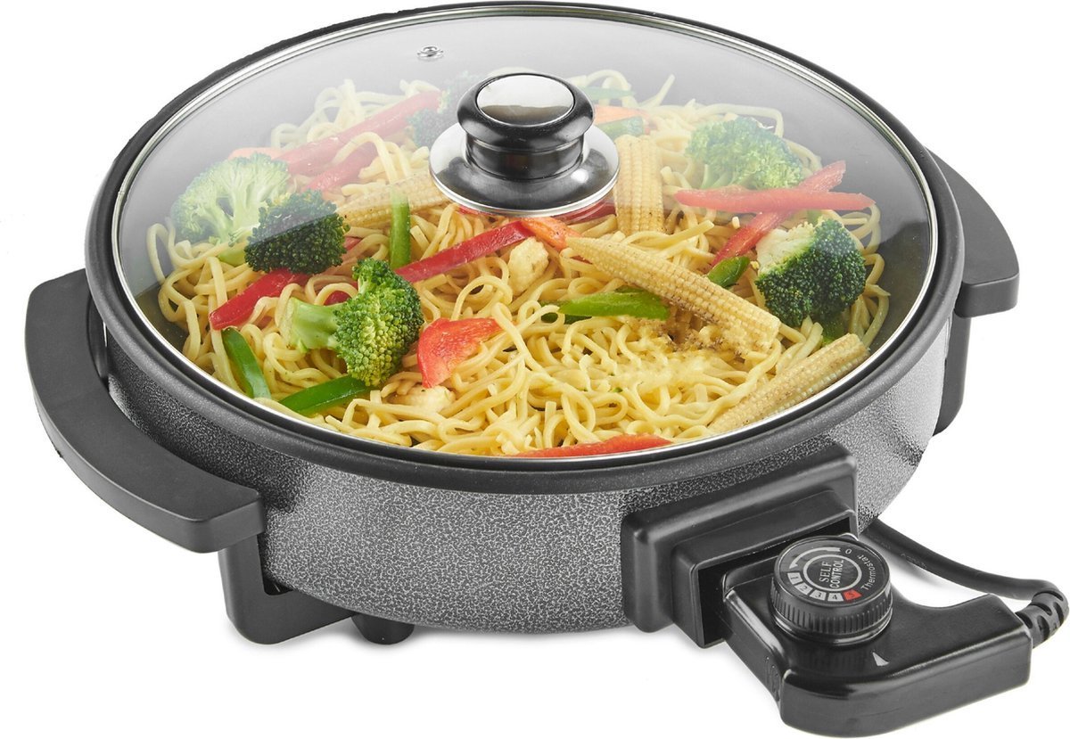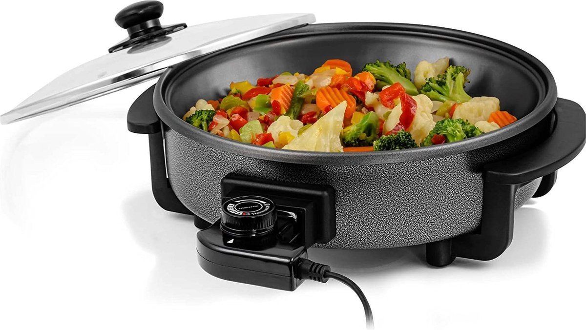 Electric Party Pan/Piza Pan with Glass Lid and Non-Stick Coating – Adjustable Heat up to 240degree – 1500W – Ø42cm – Black – Cheffinger