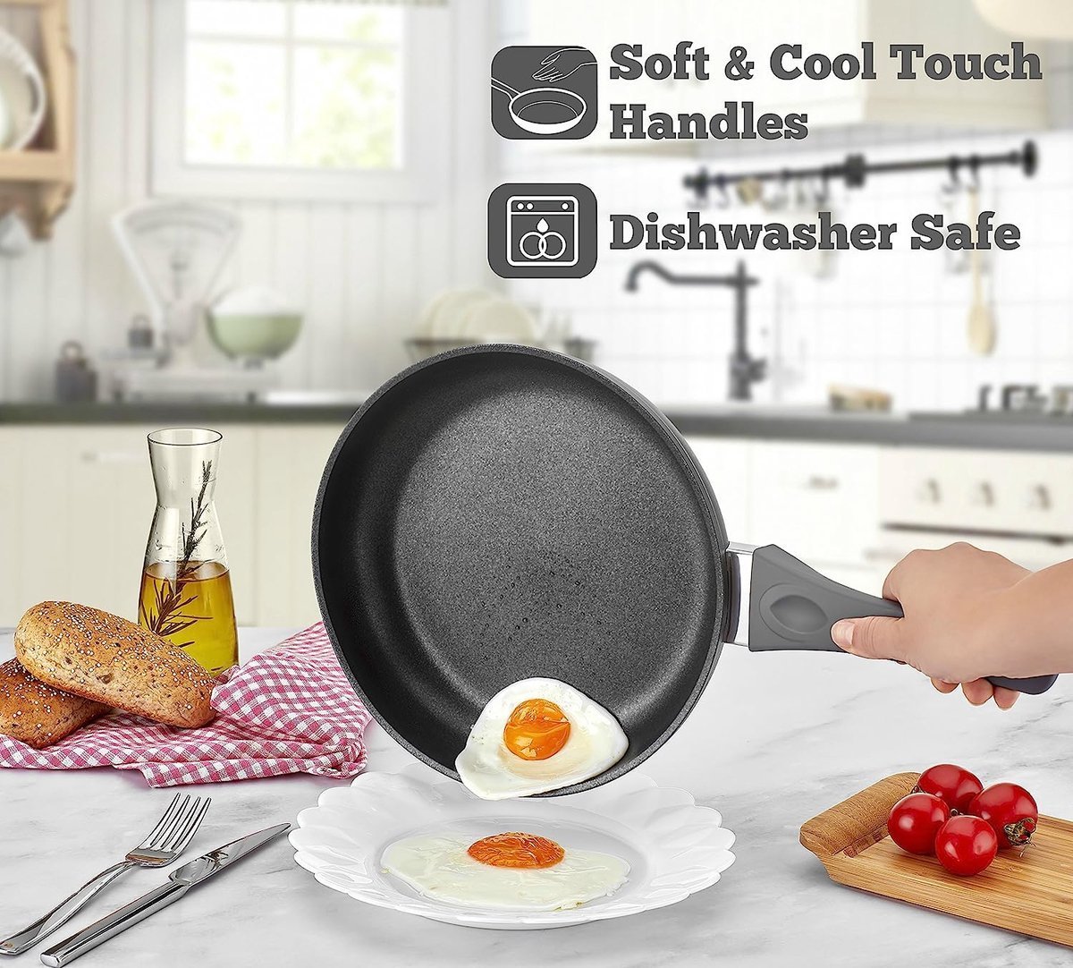 The pan sets have a total of five layers, including 3 non-stick layers, a cast aluminum alloy and a mega-thermal and wear-resistant outer layer. This frying pan set uses the premium non-stick coating from Germany, which offers an excellent combination of scratch resistance and non-stick, for maximum non-stick effect and high durability. The sturdy die-cast aluminum housing ensures fast and even heating, saving time and energy.