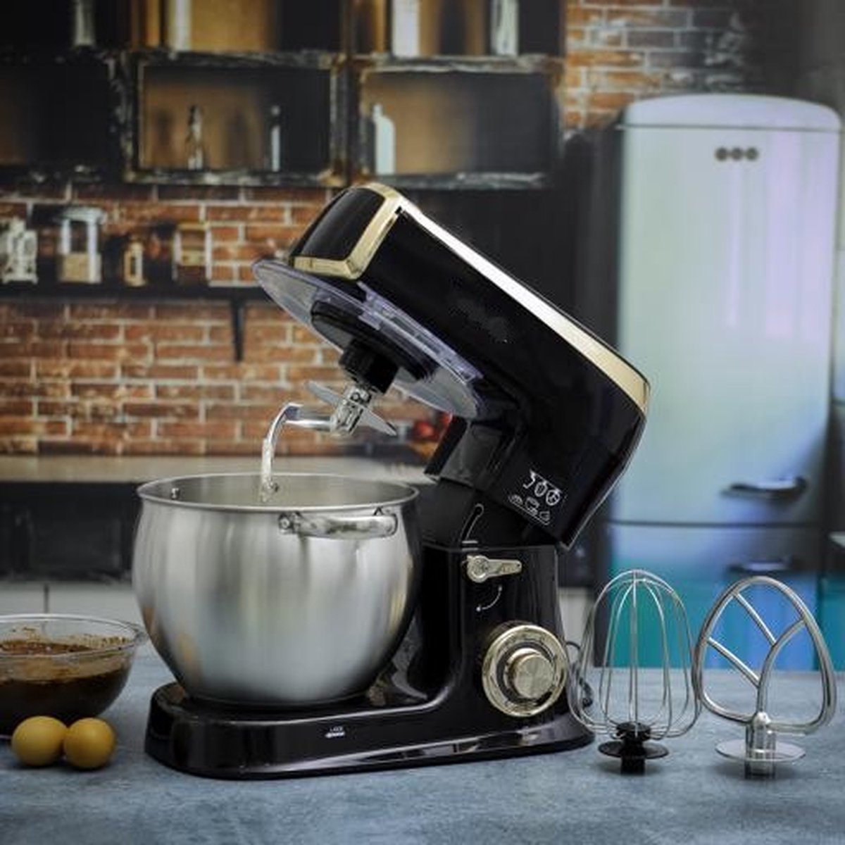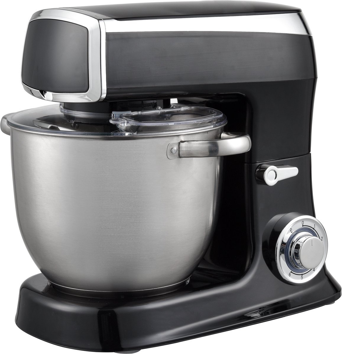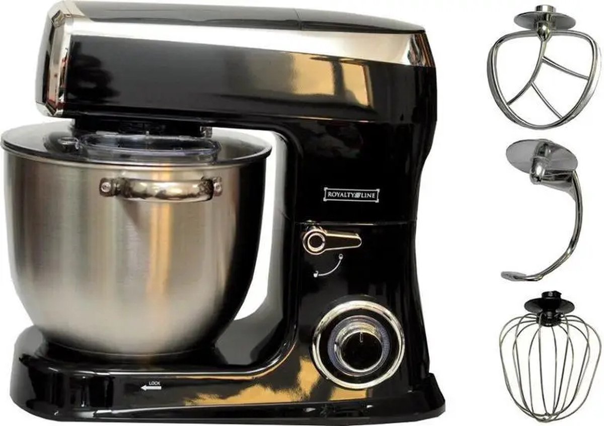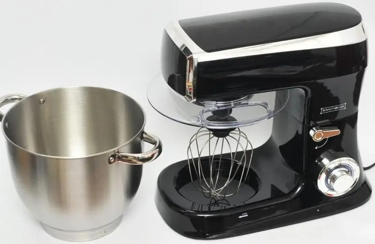 Planetary Mixer With Whisk, Dough Hook, Mixing Hook, Pan Scraper, With Splash Guard & Stainless Steel Mixing Bowl 7.5 L- 2100W – Black – Royalty Line