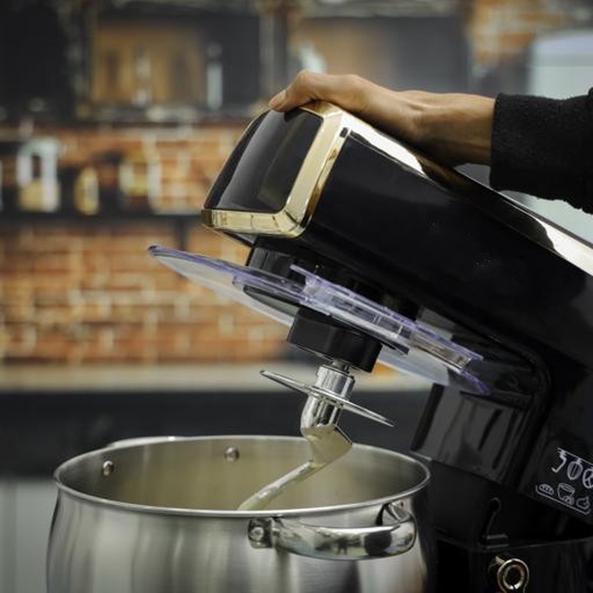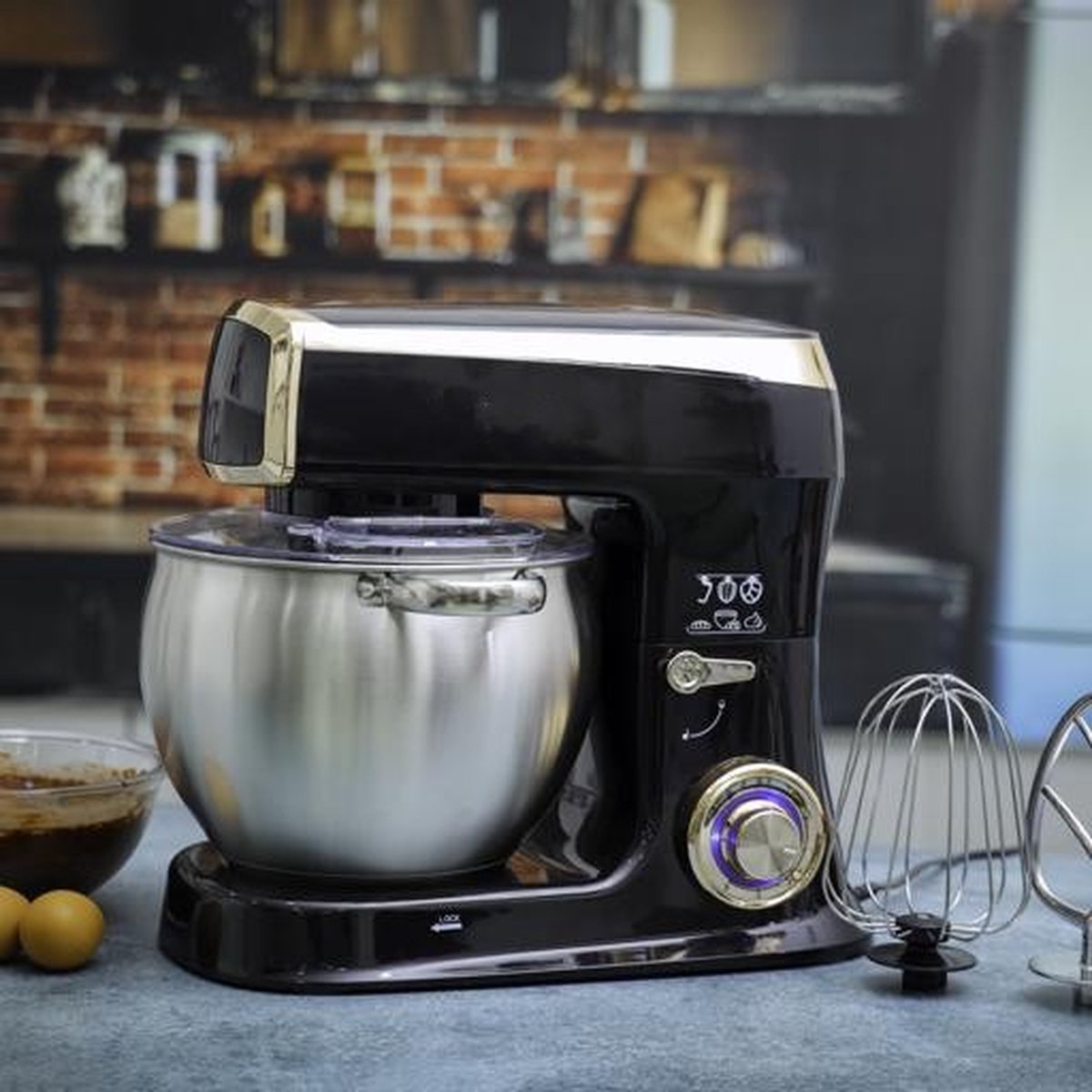 In addition to the stainless steel bowl, the kitchen machine comes with a splash guard, kneading hook, whisk and mixing arm. 7.5 Liter bowl provides enough capacity for your family.