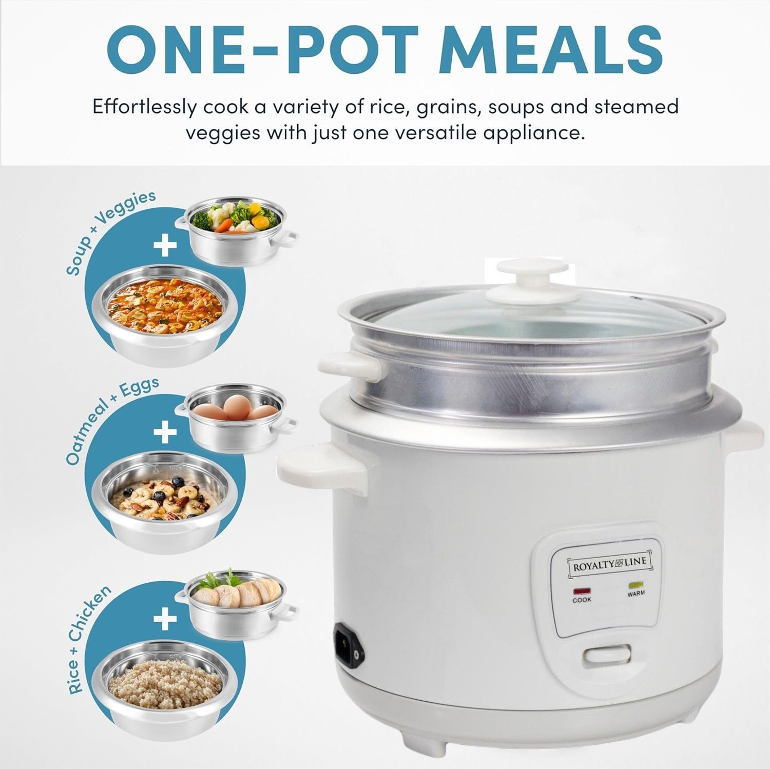 Enjoy easy home cooking with the Royalty Line Rice Cooker and Food Steamer. Restaurant-quality rice. Healthy steamed meals. Delicious one-pot meals. Prepare all this and more at the touch of a button! Royalty Line takes the “chef” out of home cooking and turns kitchen time into your time. Help the kids with homework, get creative during playtime, or pick up that novel you’ve been waiting to dive into. All while delivering warm, hearty, and healthy meals the whole family will love.