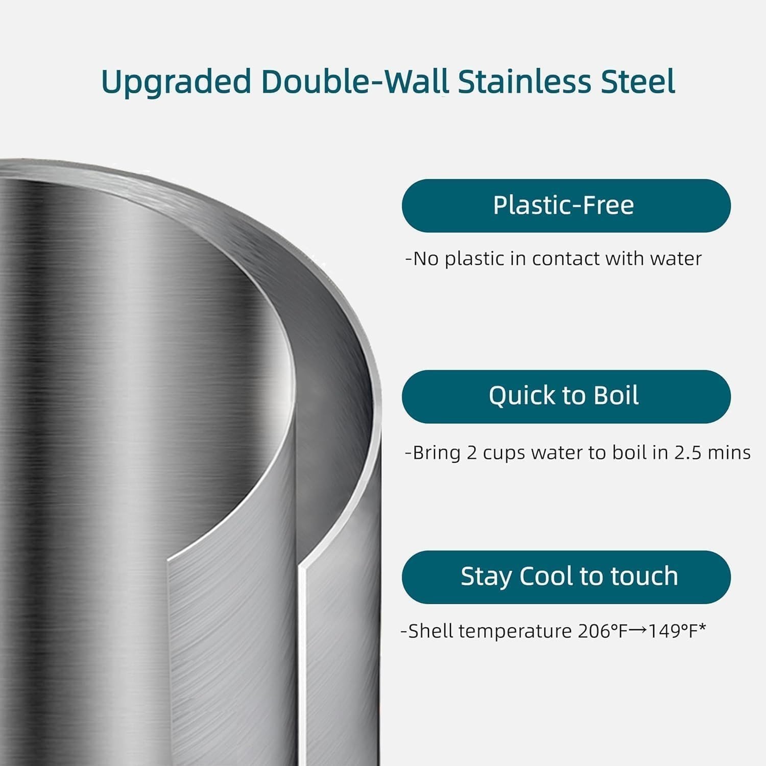 - Automatically shuts off when water boils and has boil-dry protection to prevent scorching when water is running low