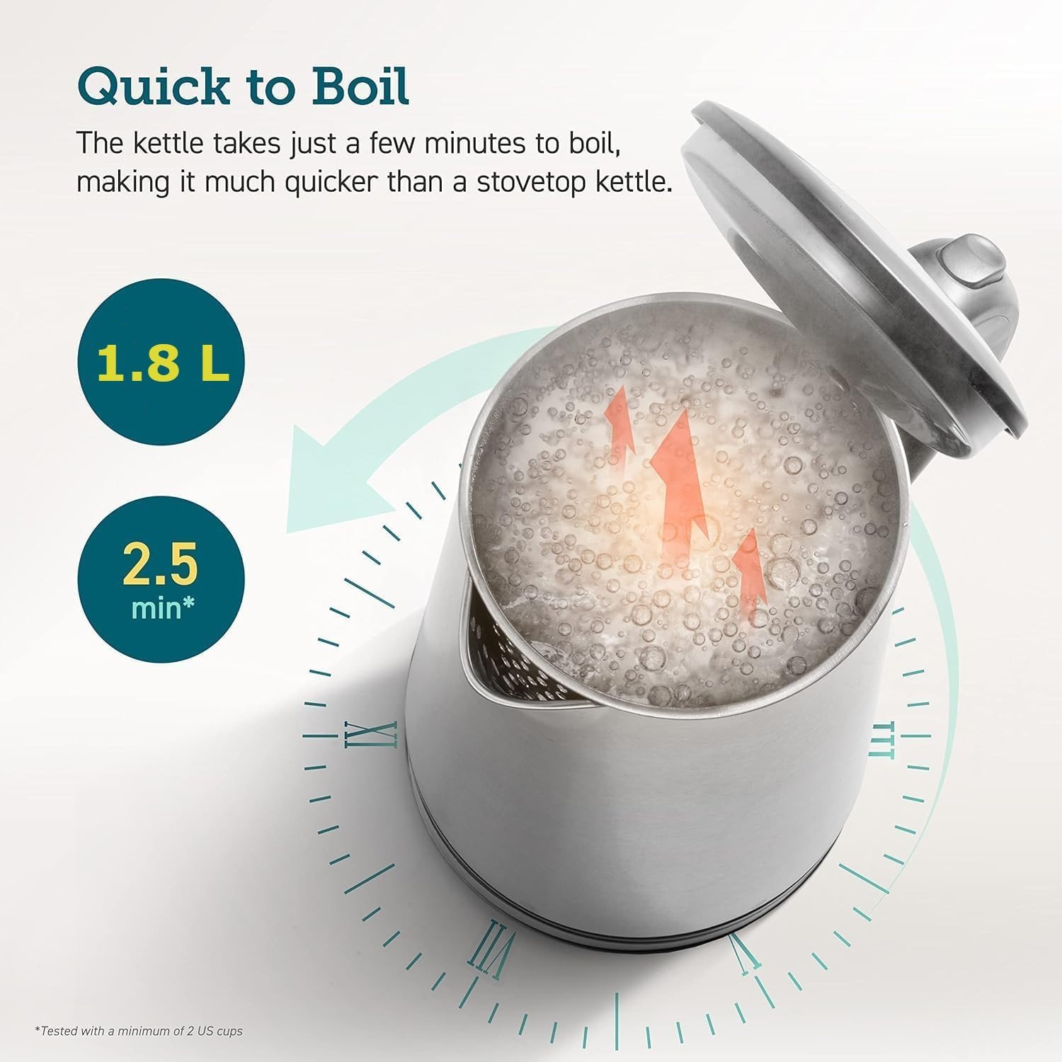 This electric kettle boils up to 1.8 liters of water faster than a microwave and more safely than a kettle on the stove. Always quickly make a hot cup of tea or French press coffee without having to wait long – perfect for hectic mornings or when you need to boil water quickly.