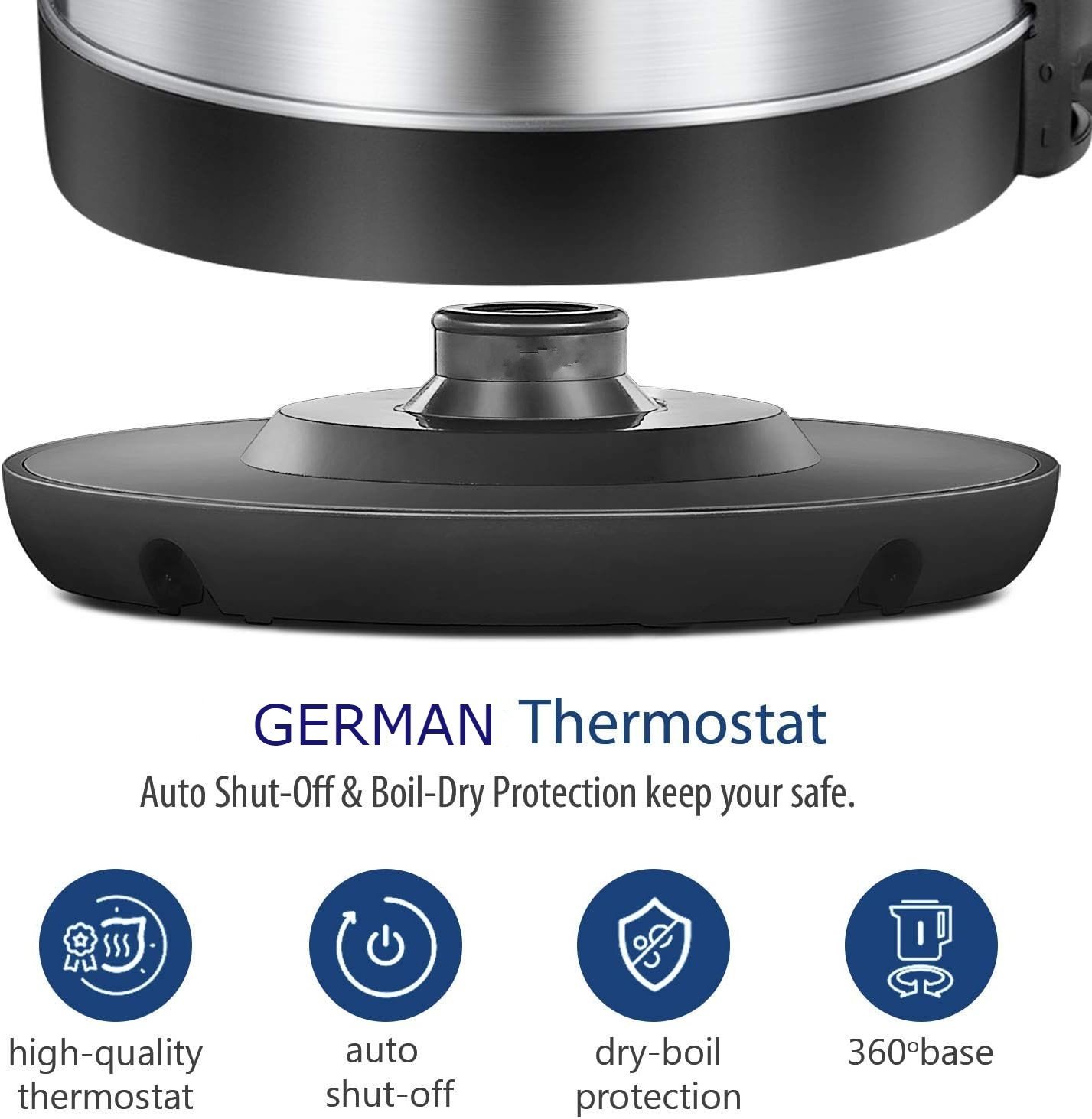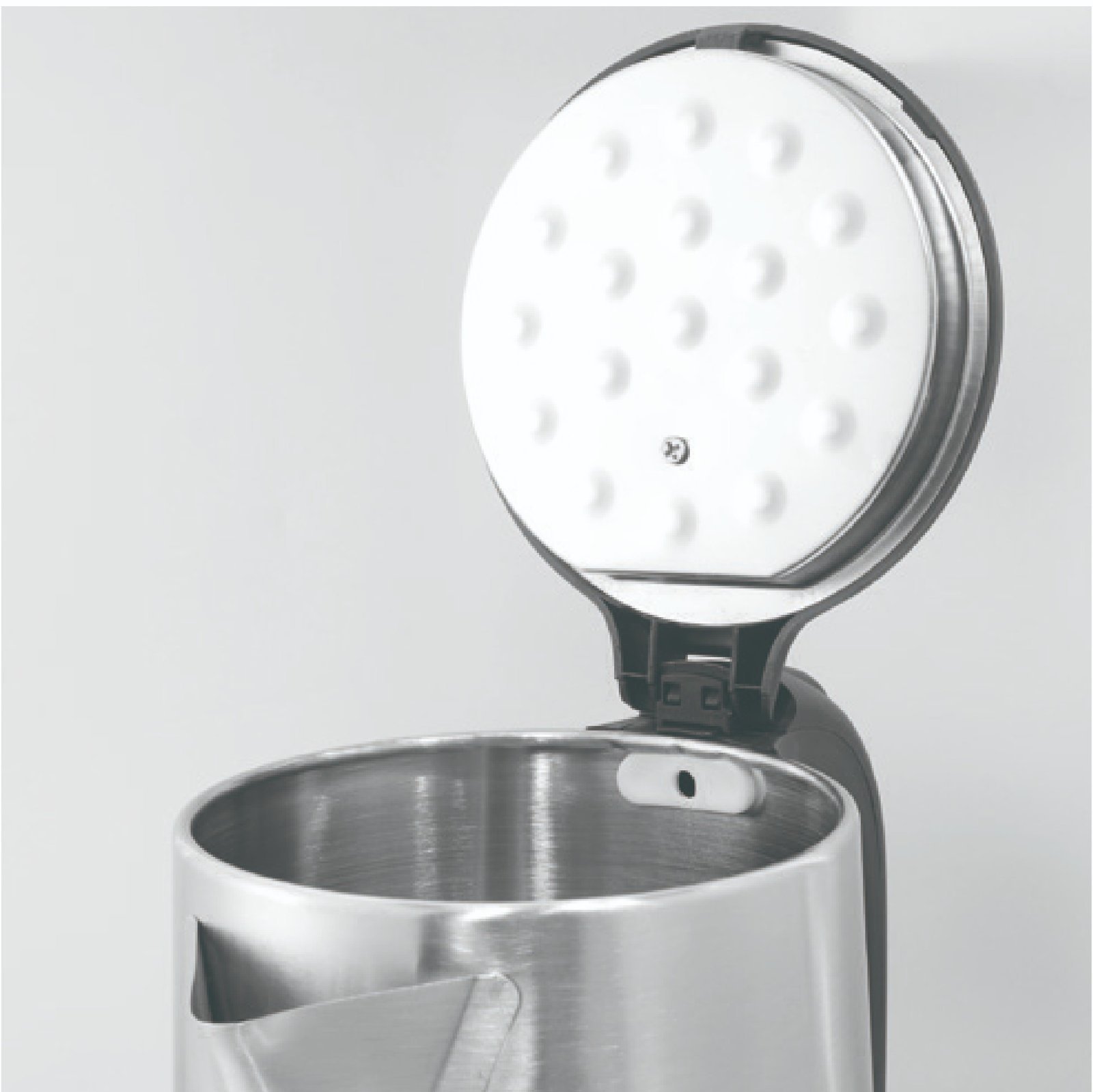 With the advanced built-in thermostat controller, the kettle has built-in auto shut-off and boil-dry protection technology. The kettle switches itself off when the water has completely boiled or when there is no more water in it.