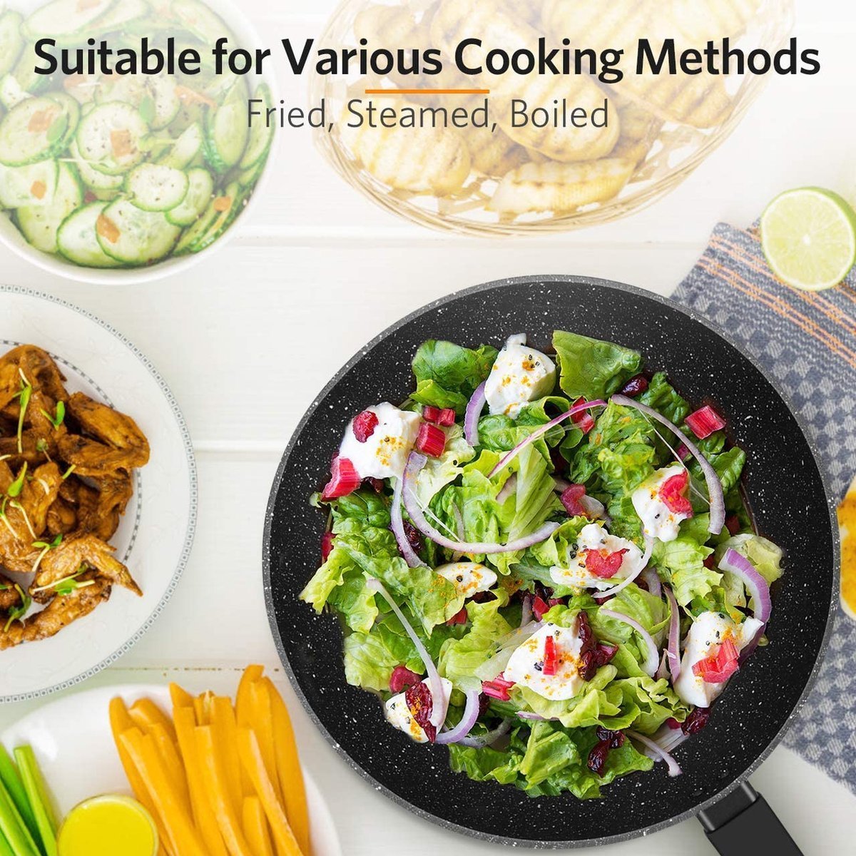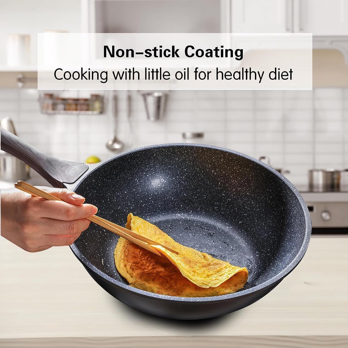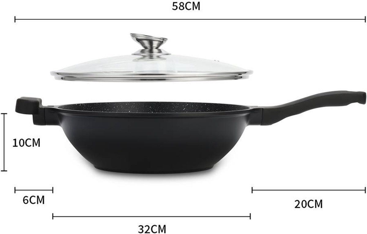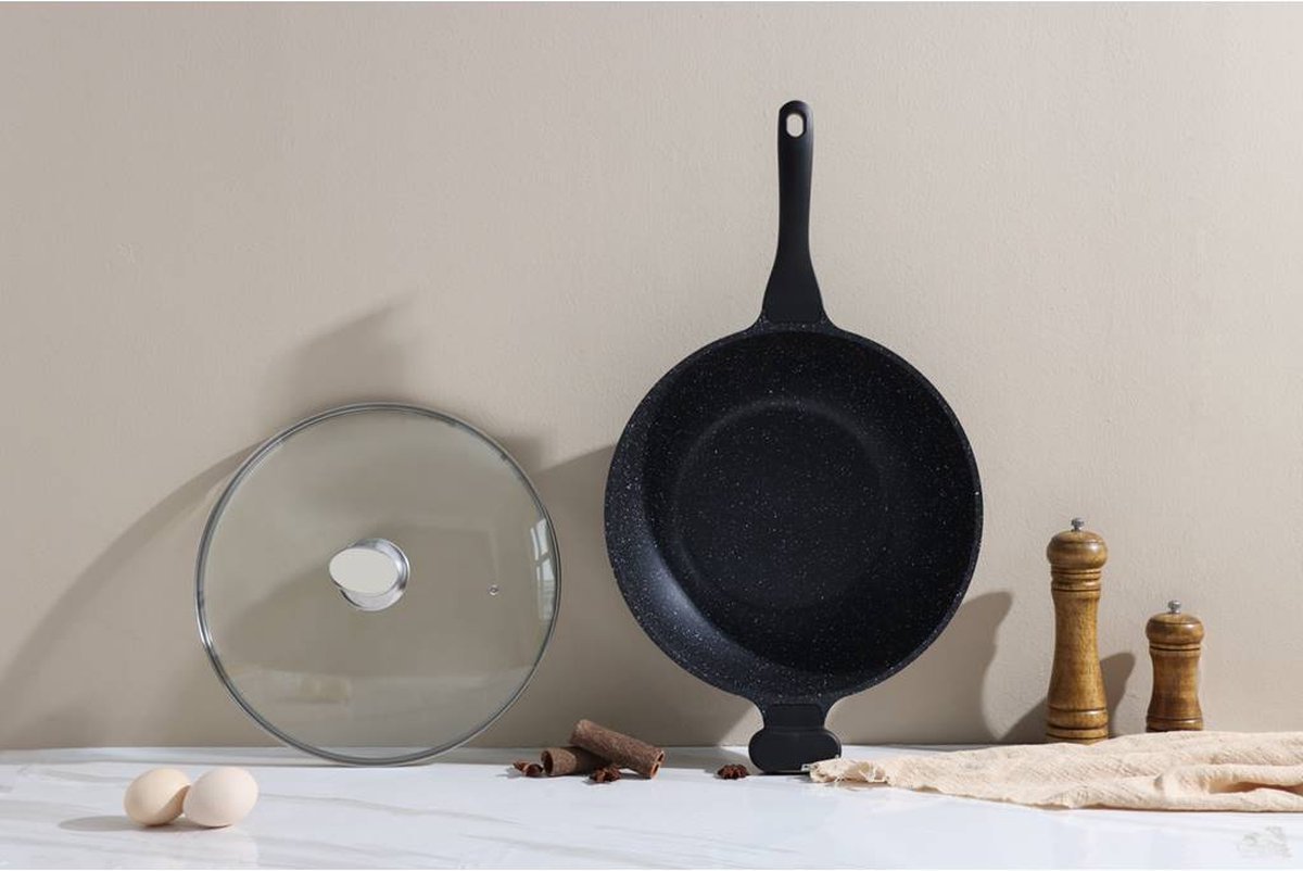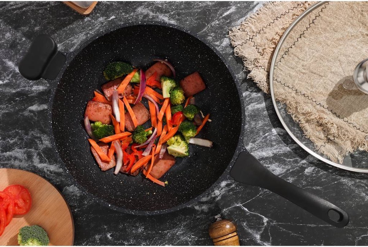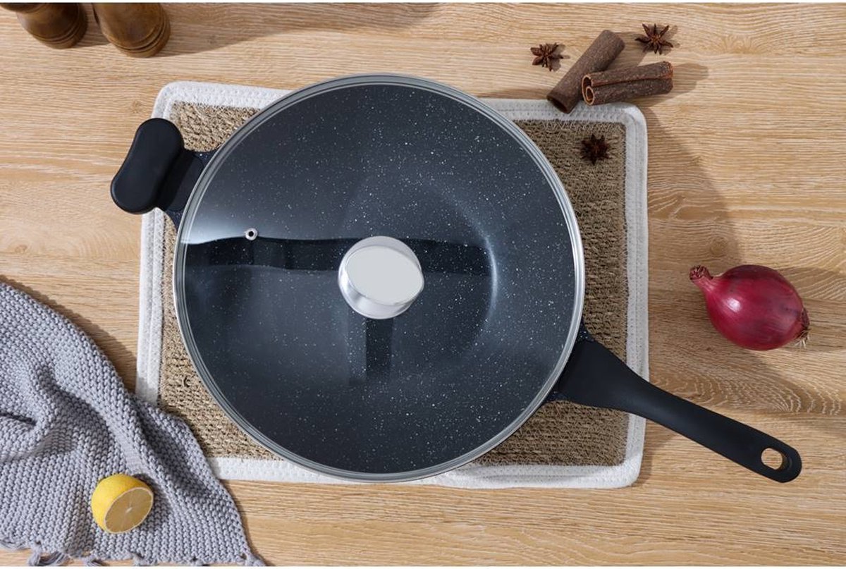 This 28cm non-stick wok pan is made from a forged aluminum alloy that conducts heat quickly and evenly with precise temperature control. Food heats quickly and evenly on this skillet and slides onto the plate once it’s ready. In addition, this frying pan can be used on stoves such as gas, induction, electric, ceramic and glass.