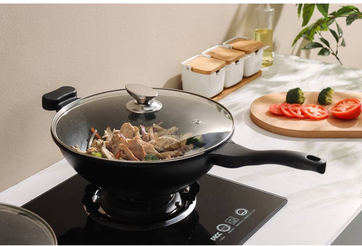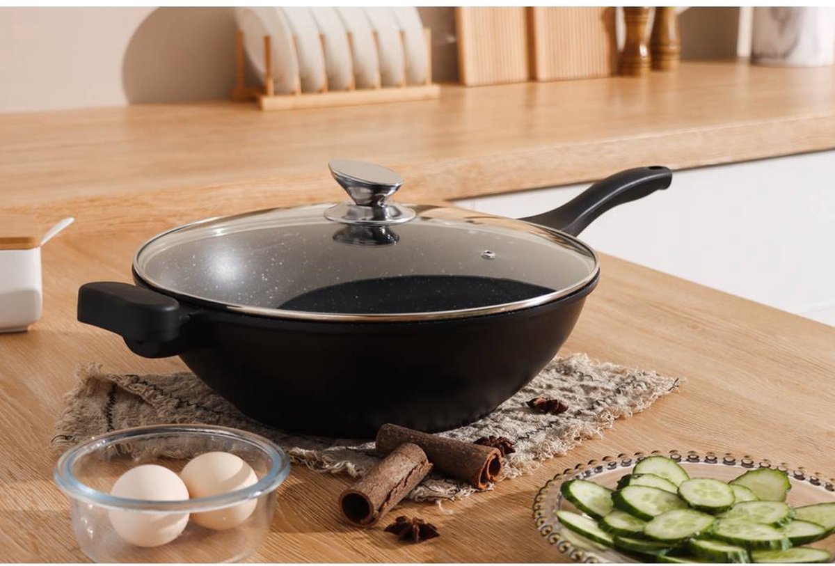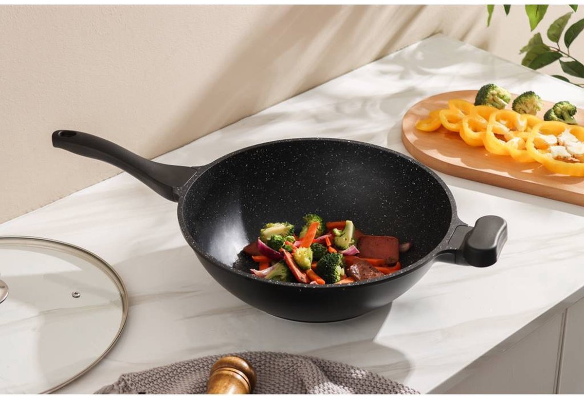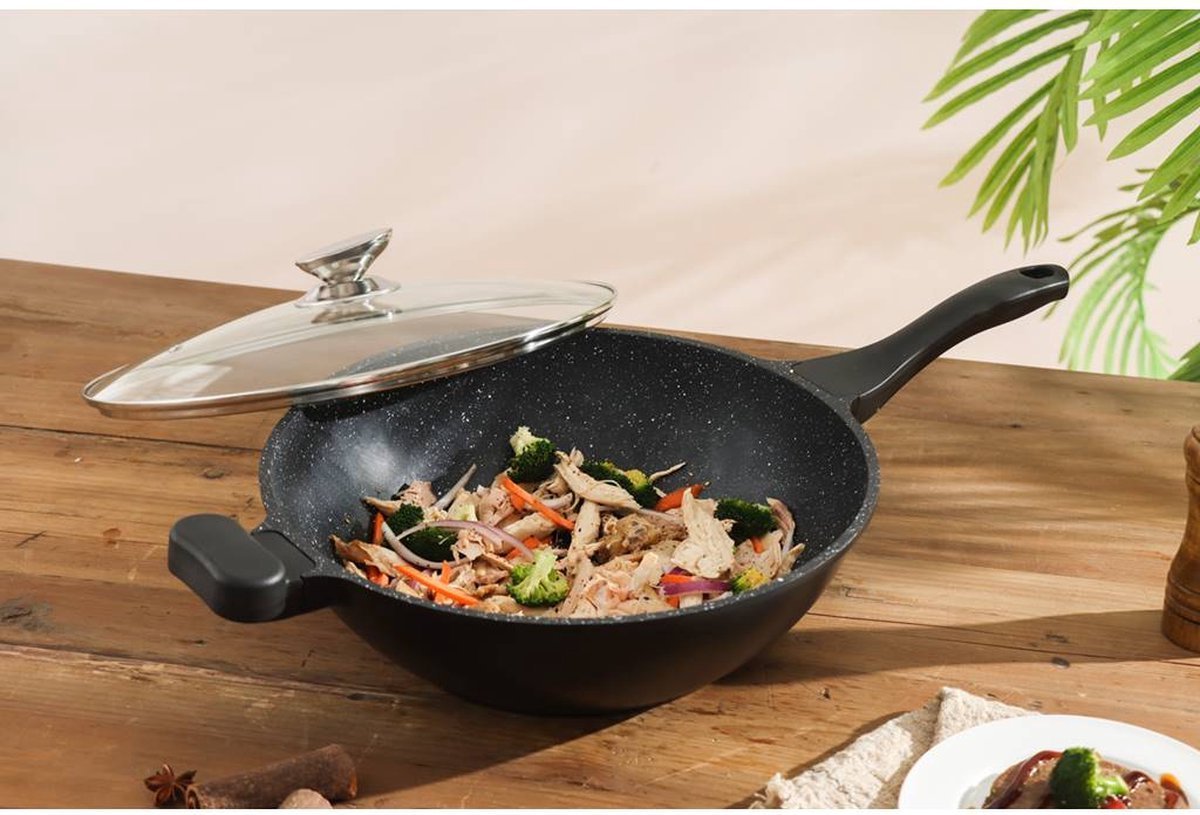 Die Cast 28 cm / 3,7L Non Stick Greblon Marble Coated Wok / Soft Tuch Handle / Gas / Elctric / Ceramic / Halogen / Induction